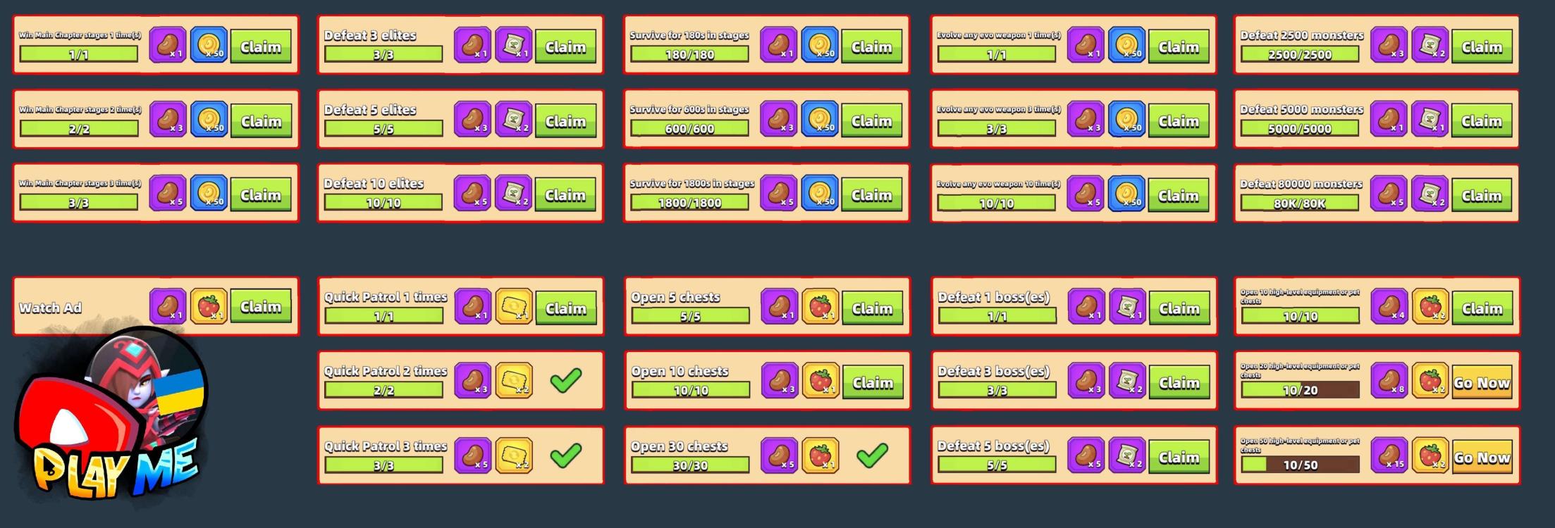 2) Defeat Elites: Main challenge, mega challenge, main chapter, and daily challenge all count.